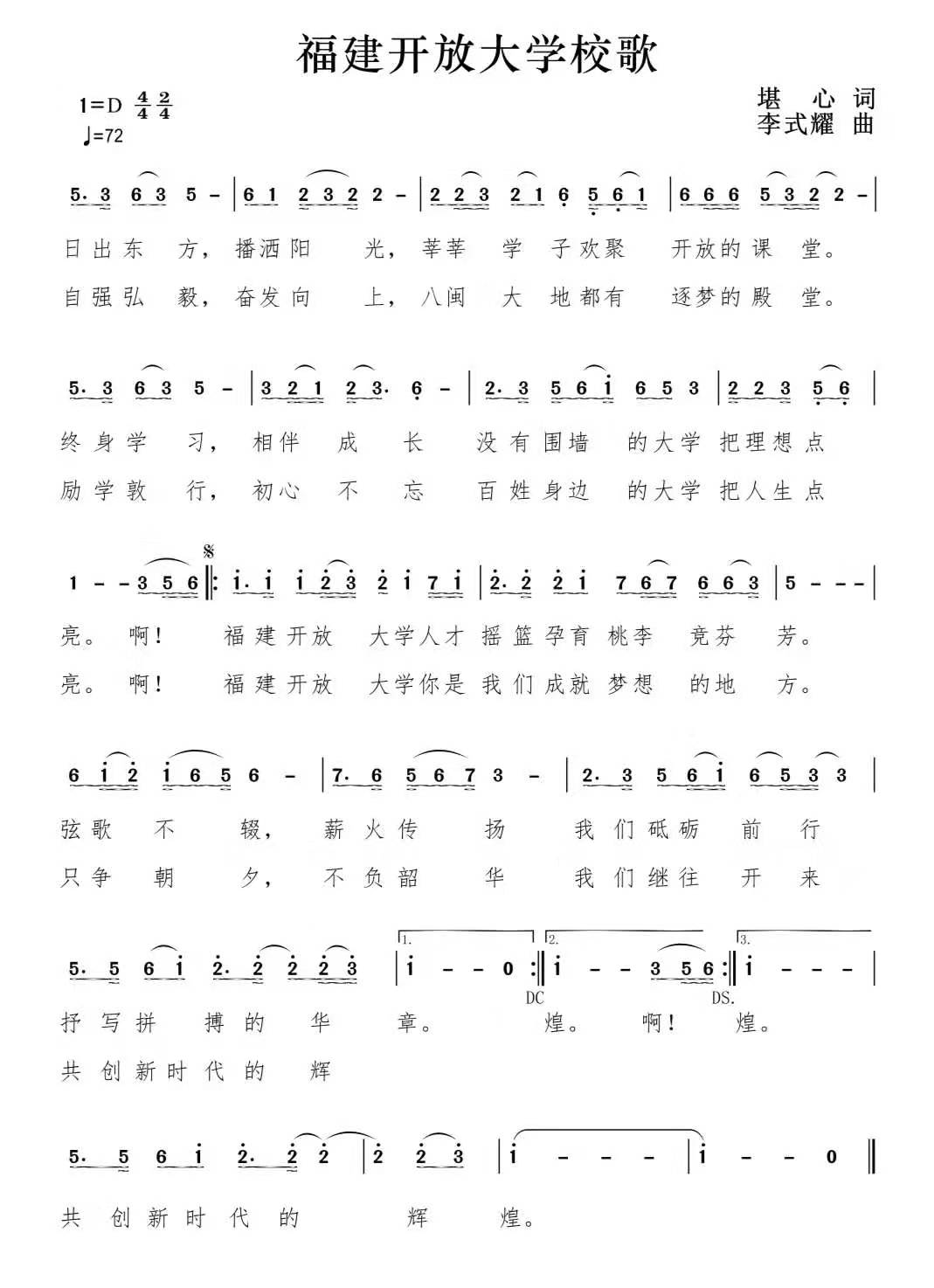 在福建广播电视大学转型发展,更名福建开放大学之际,学校启动校歌征集和音乐创作工作,从来自全国22个省市自治区151篇歌词征集作品中,评选出湖北作家邓智星的作品作为校歌歌词,并聘请福建省人大代表,著名作曲家李式耀谱曲,北京亚洲爱乐乐团演奏录制,隆重推出《福建开放大学校歌》。12月29日,举办了“唱校歌 抒豪情 喜迎建党百年”师生歌咏比赛。