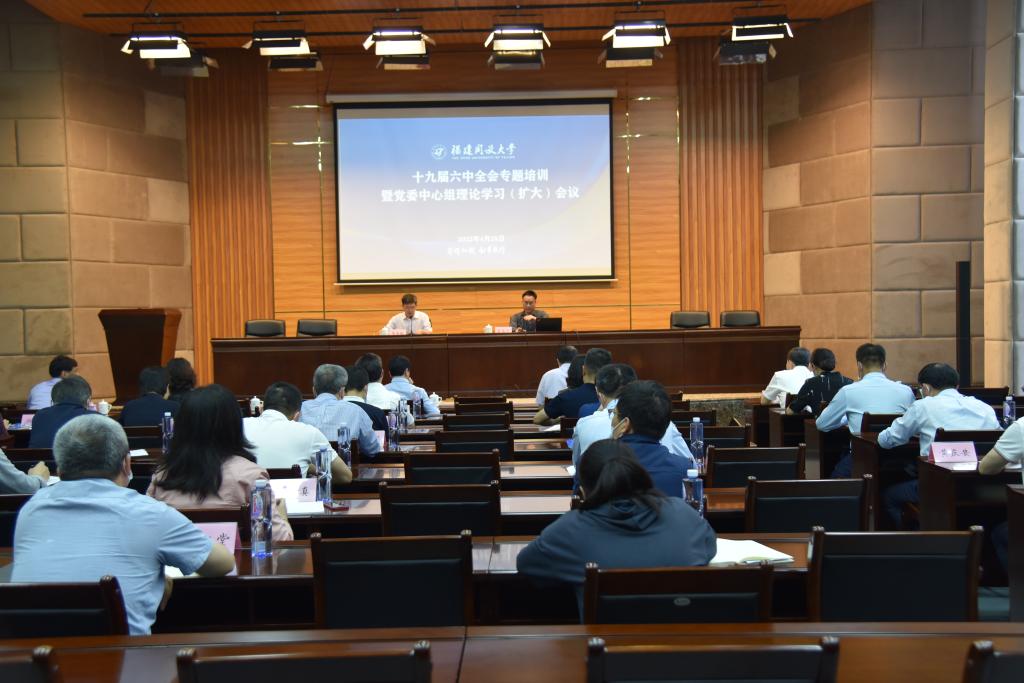 4月28日下午,学校在桂山校区博厚楼会议厅召开党的十九届六中全会专题培训暨党委中心组理论学习(扩大)会议,邀请福州大学马克思主义学院教授詹志华作题为《在高度历史自觉中牢牢掌握历史主动——党的十九届六中全会精神解读》专题讲座。校领导班子成员、处级以上干部,各党总支、党支部书记参加学习。党委副书记马成斌主持会议。