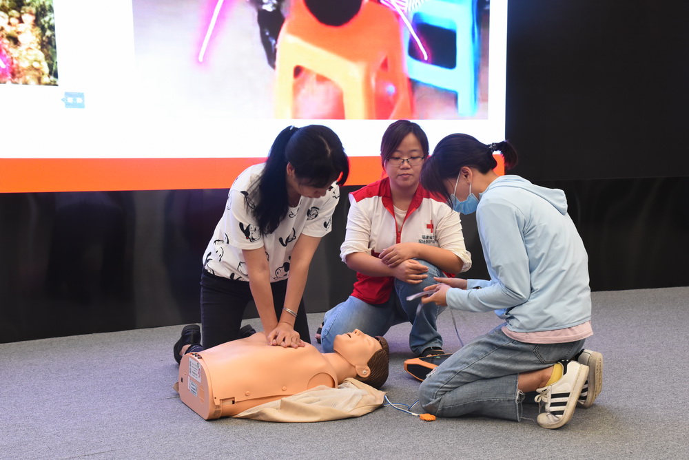 培训现场,省红十字会救护师资刘丽琴老师就现场心肺复苏术及气道异物梗塞现场急救、自动体外除颤器(AED)的使用方法,常见急症、意外伤害、突发事件的处置等内容,以互动的形式进行了现场讲解;参训学员在老师的指导下,现场操作了人工呼吸和心肺复苏的操作方法,以及成人和婴幼儿气道异物梗阻处理的技能演练。省红十字会现场应急救护中心还发放了安全救护手册,使“人人学急救、急救为人人”的生命健康教育理念在校园内进一步得到宣传推广。