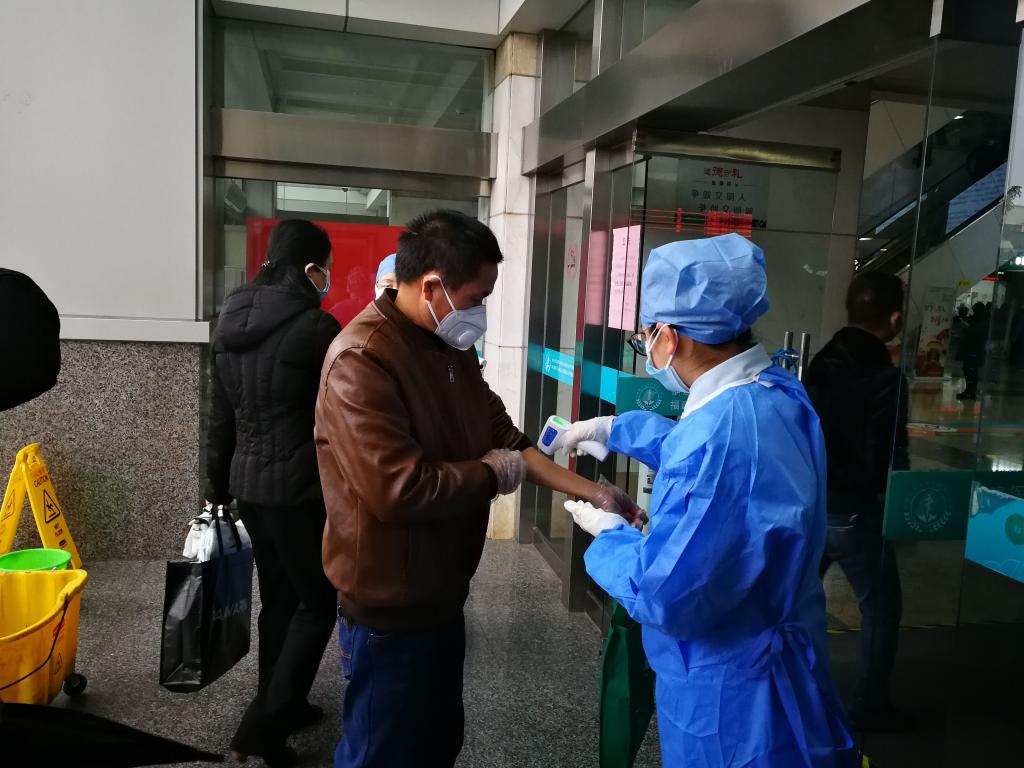 林娜为来院诊治的人员测量体温